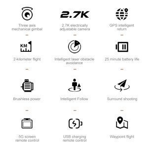 Professionell GPS-drönare, 3 kilometers flyglängd,Treaxlig gimbal EIS elektronisk stabilisering, GPS-pekning, 4,5-tums HD-fjärrkontrollskärm, 5G realtidsbildöverföring, GPS-följning, GPS-positionering, optisk flödespositionering, GPS+optisk flödesdubbelmod, GPS-retur med ett klick, GPS-intelligent retur (retur över avstånd, retur vid låg batterinivå, retur vid bortflykt), intelligent laserhinderundvikande, högupplöst 4K-kamera, GPS-intelligent följning, omgivande flygning.